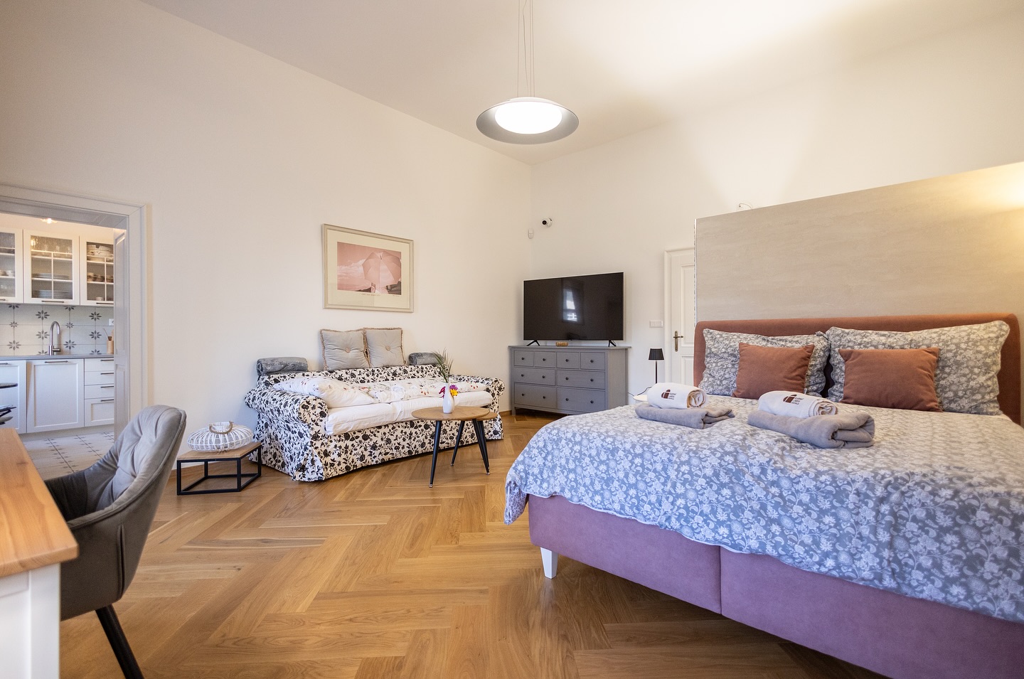 Dieses einzigartige Apartment, das von Danka Haviarová (@amaliaakarol) entworfen wurde, vereint die historische Noblesse der Schlossräume, modernes Design und den Geist toskanischer Eleganz. Es ist komplett ausgestattet mit einem Doppelbett, einem Schlafsofa für zwei weitere Personen, einer voll ausgestatteten Küche und einem luxuriösen Badezimmer.