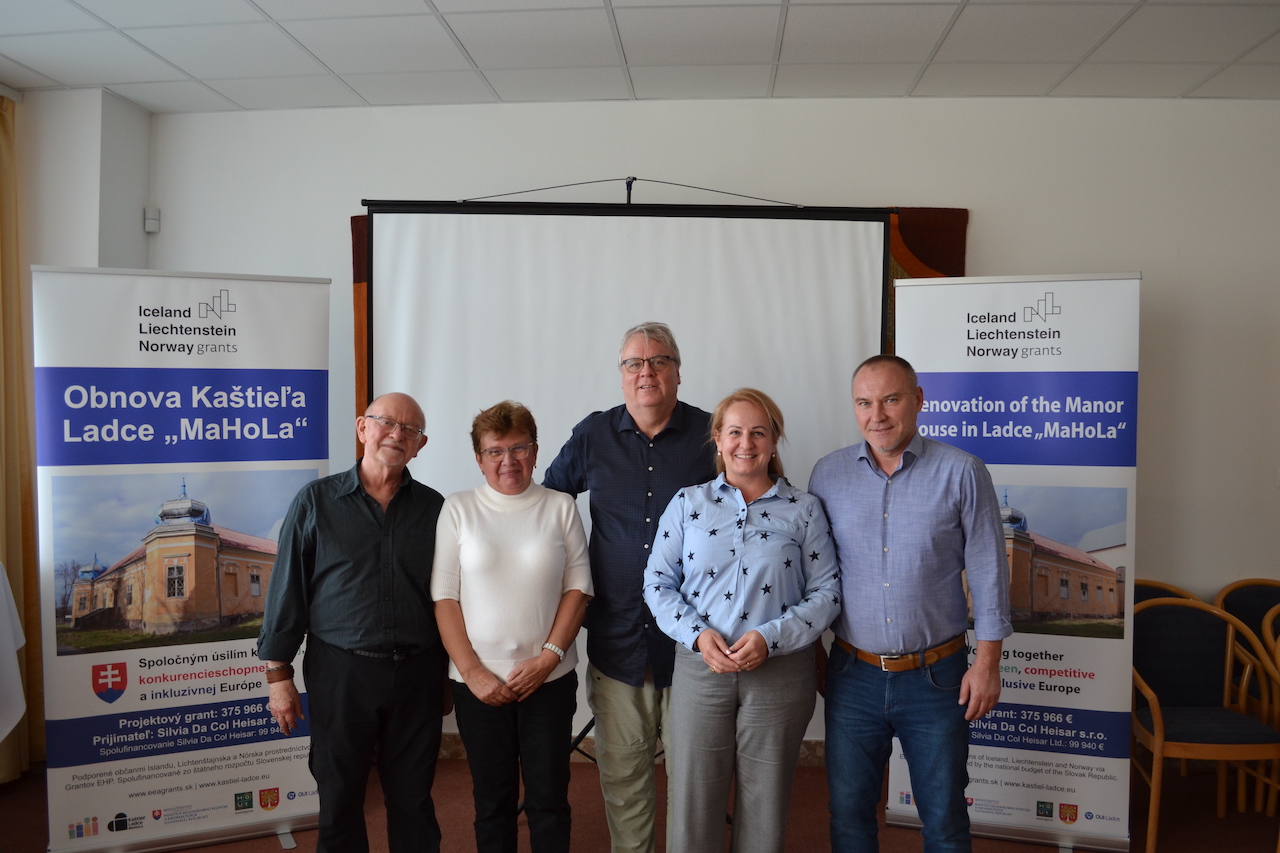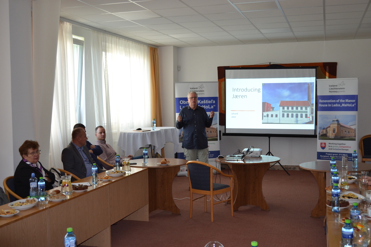 On 17 October 2022 Ladce experienced an unusual visit. The municipal office witnessed a visit of representatives of the Norwegian partner of the project of restoration of a part of the manor house from the College for Green Development (Høgskulen for grøn utvikling) from the town of Bryne in southern Norway. The purpose of the visit was a full-day seminar led by community development specialists Johan Barstad, an economist, and Rhys Evans, a human geographer. The aim of the seminar was to present the Norwegian approach to local cultural heritage, especially in terms of economic benefits.